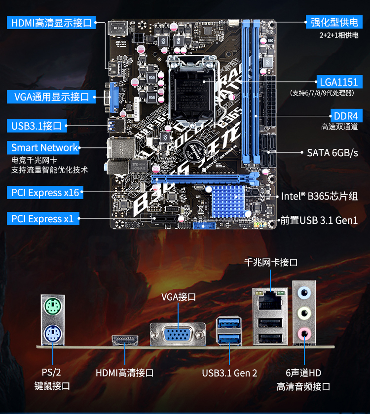 IO接口方面,狂龍B365M-VH的配置中規(guī)中矩,HDMI+VGA的視頻輸出接口,支持雙屏顯示輸出。千兆網(wǎng)卡和USB3.1等基本也是標(biāo)配的接口了,同時還保留了PS/2鍵鼠接口,這對于使用老式鍵鼠的用戶來說,可謂利好。